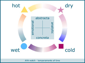 ![]() Temperaments: dry, cold, wet, hot Dimensions: abstracta, concreta, emotional, analytic AYA-watch - temperaments of time |